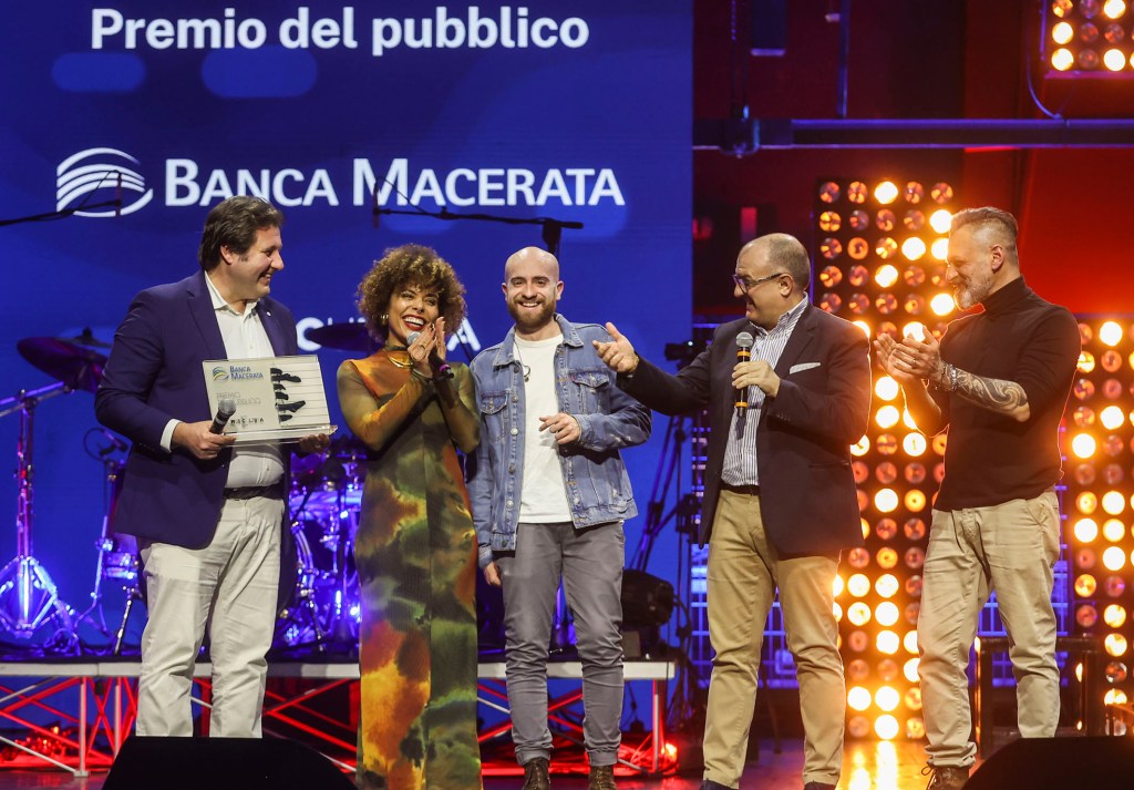 A consegnare il premio assegnato dal pubblico per la migliore esibizione della serata, il Direttore della filiale di Porto San Giorgio di Banca Macerata Marco Turtu’ e l’Assessore ai Grandi Eventi del Comune di Macerata Riccardo Sacchi.