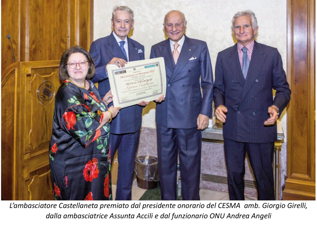 Nel recente consuntivo sull’attività dell’anno trascorso del CE.S.MA. (Centro Studi Marche – Roma), spicca il conferimento all’ambasciatore Giovanni Castellaneta della distinzione onorifica di “Marchigiano ad honorem”. Tale riconoscimento viene assegnato annualmente a personalità non marchigiana la quale, oltre ad avere raggiunto prestigiosi traguardi, ha anche ben operato nelle Marche e per le Marche. La cerimonia ha luogo al Senato della Repubblica italiano e viene curata dalla rinomata istituzione culturale marchigiana – presidente l’imprenditore Umberto Antonelli – da decenni operativa a Roma. Tra i suoi maggiori eventi c’è appunto dal 1984 l’ assegnazione di riconoscimenti ( il “marchigiano dell’anno”) ad esponenti delle Marche che si siano distinti in vari settori ( arte, scienza, imprenditoria, Pubblica amministrazione ).