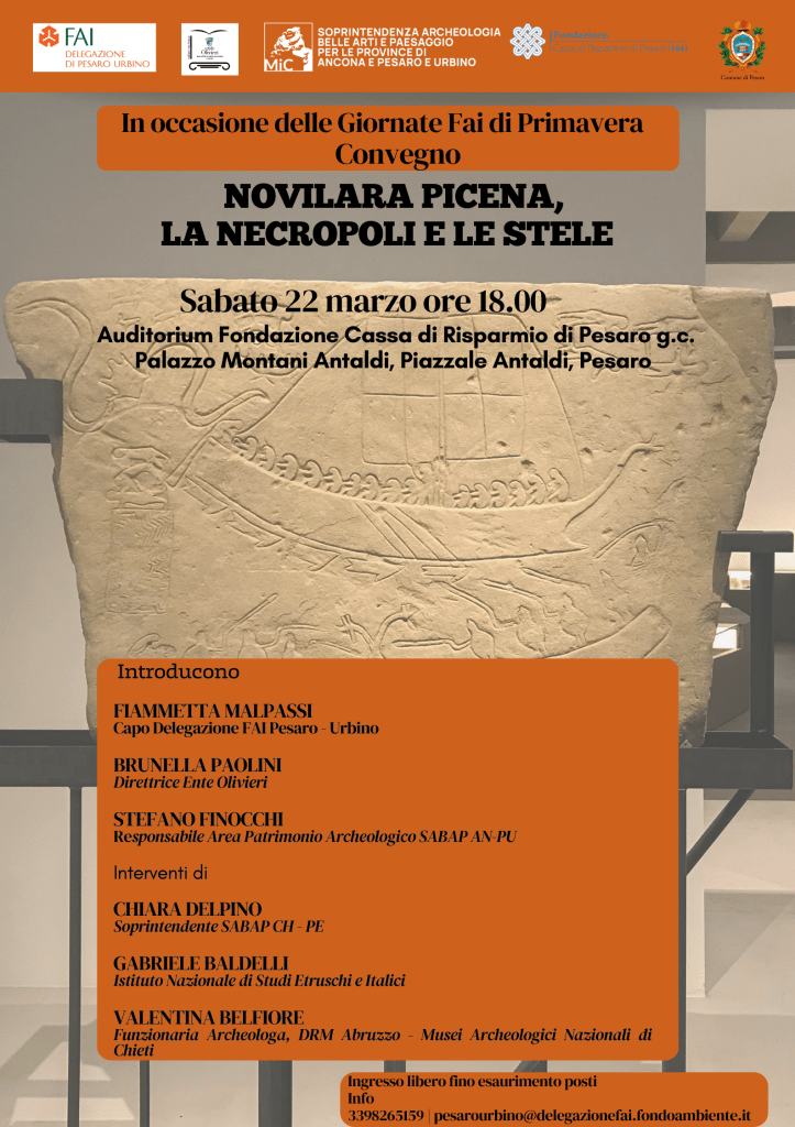 Il convegno, introdotto da Fiammetta Malpassi, Capodelegazione Fai Pesaro – Urbino, Brunella Paolini, direttrice dell’Ente Olivieri e Stefano Finocchi, Responsabile Area Patrimonio Archeologico SABAP AN – PU, vedrà gli interventi di Chiara Delpino, Soprintendente SABAP Ch-Pe ( Recenti indagini nella Necropoli Picena di Novilara), di Gabriele Baldelli, Istituto Nazionale di Studi Etruschi e Italici (Contesti e modalità di acquisizione delle stele iscritte e figurate di Novilara) e Valentina Belfiore, Funzionaria Archeologa DirezionE regionale Musei Nazionali di Abruzzo (Le stele di Novilara e i loro modelli figurativi ed epigrafici).