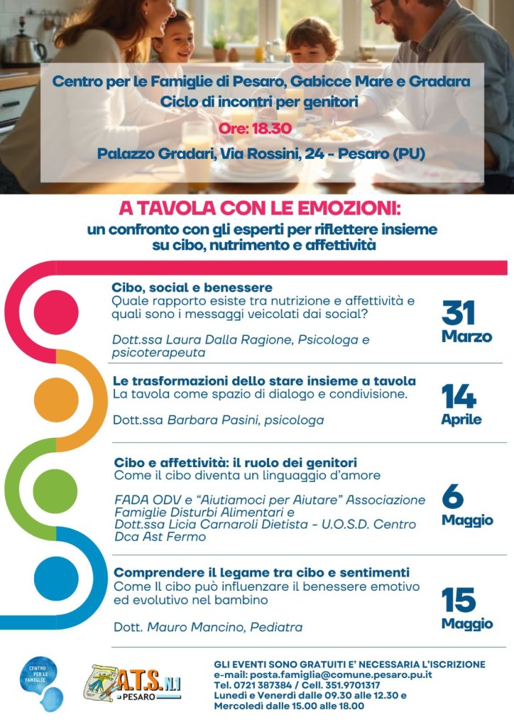 Riflettere su cibo, nutrimento e affettività, questo l’obiettivo del ciclo di 4 incontri gratuiti insieme a pediatri, psicologi, pedagogisti, dal titolo “A tavola con le emozioni” al via dal 31 marzo, promosso dal Centro per le famiglie di Pesaro, Gabicce Mare e Gradara dell’Ats1.