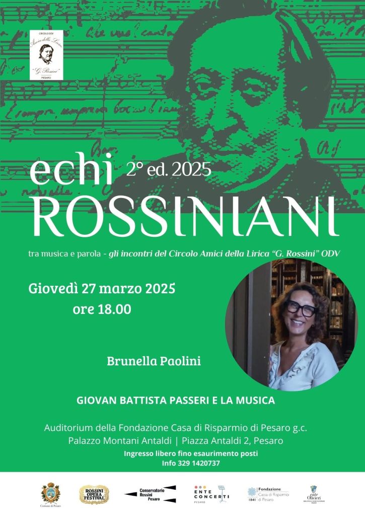 Questa inclinazione del colto mecenate pesarese è, infatti, quasi del tutto inesplorata: sarà Brunella Paolini, direttrice dell’Ente Olivieri, a svelare il rapporto tra Passeri e l’arte di Euterpe nel nuovo appuntamento della rassegna Echi Rossiniani – Tra Musica e Parola