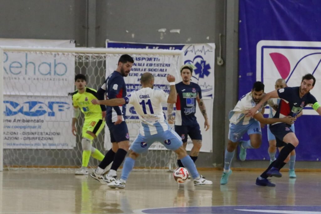 MANFREDONIA – Un avvio di gara decisamente negativo, una grande reazione con conseguente rimonta e una doccia gelata alla fine. Questo è ciò che resta dalla trasferta di Manfredonia, casa della Vitulano Drugstore. Tanta amarezza, dunque, al termine della ventitreesima giornata di Serie A. Con questo risultato, l’Italservice Pesaro resta a quota 19 punti, in zona playout, a 3 punti dalla salvezza diretta e ad una lunghezza dal prossimo avversario, la Pirossigeno Cosenza. Dopo essere andati sotto di tre reti, i ragazzi di mister Bargnesi hanno rimontato fino al 3 a 3. Da quel momento la gara si è giocata sugli episodi, sui dettagli. Ad avere la meglio, a pochi secondi dalla sirena, sono stati i padroni di casa grazie al colpo dell’ex Andrè Ferreira. Dolorosissimo e decisivo.