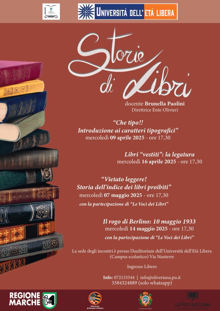 Origine e storia di caratteri tipografici e legatura, ma anche episodi storici in cui i libri e i loro contenuti sono stati protagonisti, come la storia dell’Indice dei Libri Proibiti e il famigerato rogo di Berlino del 10 maggio 1933: la seconda edizione del seminario “Storie di Libri”, organizzato da Università dell’Età Libera, propone un coinvolgente itinerario tra gli aspetti più tecnici dei “libri”, fino a quelli storico – emozionali, condotto dalla direttrice dell’Ente Olivieri Brunella Paolini.
