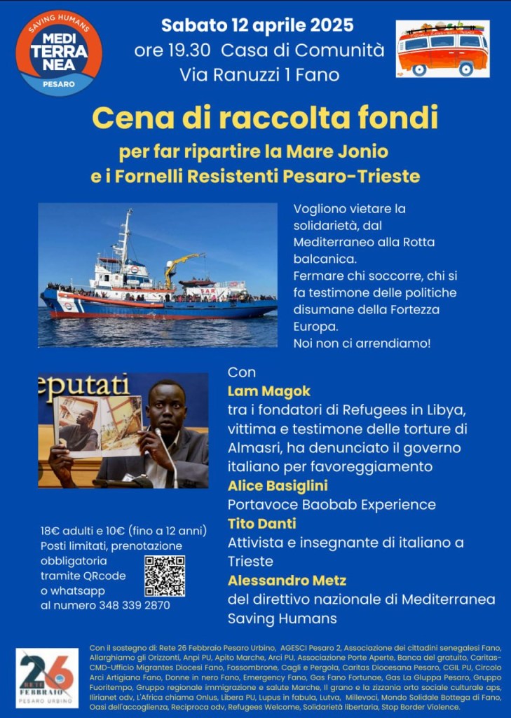 Sabato 12 aprile 2025 alle ore 19.30 presso la Casa di Comunità in Via Ranuzzi 1 Fano si terrà una cena di raccolta fondi per far ripartire la Mare Jonio, imbarcazione di Mediterranea Saving Humans e a sostegno del Progetto “Fornelli Resistenti” che da Pesaro porta solidarietà concreta attraverso pasti caldi ai migranti in transito a Trieste.
