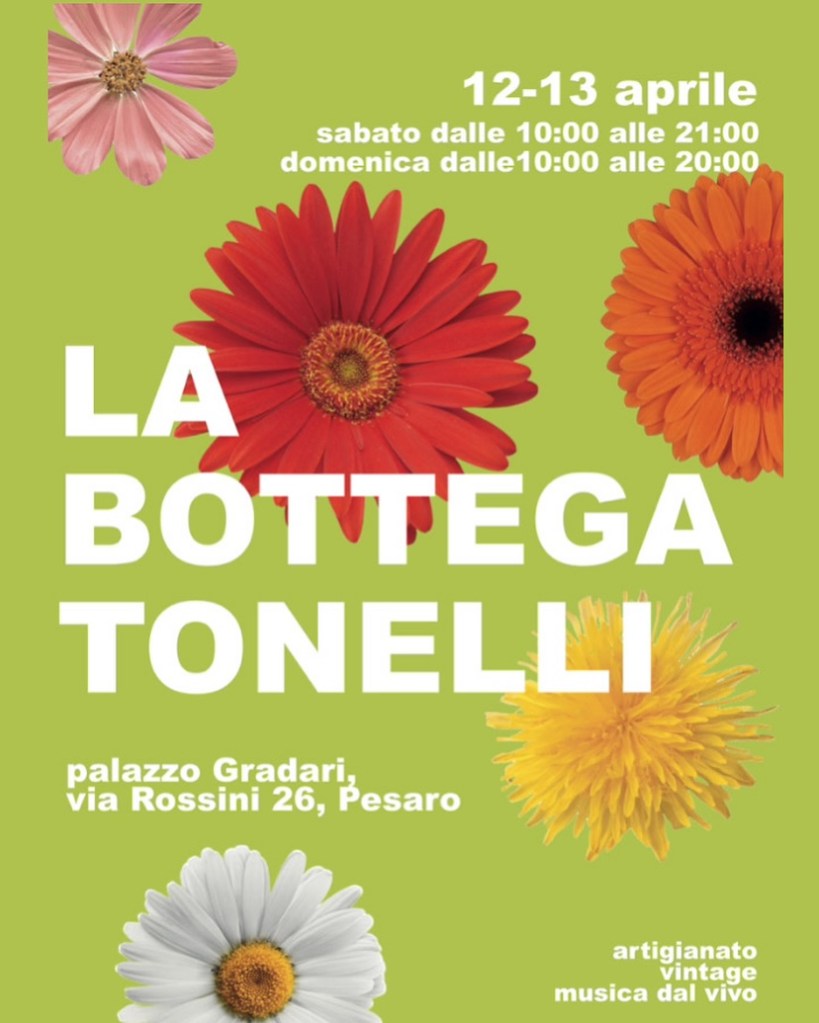 Sabato12 aprile, dalle 10 alle 21 e domenica 13 aprile, dalle10 alle 20, a palazzo Gradari (via Rossini 26): «un week end di artigiano, vintage e musica dal vivo con “La bottega Tonelli”, dove passare del tempo di qualità comprando manufatti artigianali, ascoltando musica, guardando spettacoli o mangiando qualcosa», ha concluso.