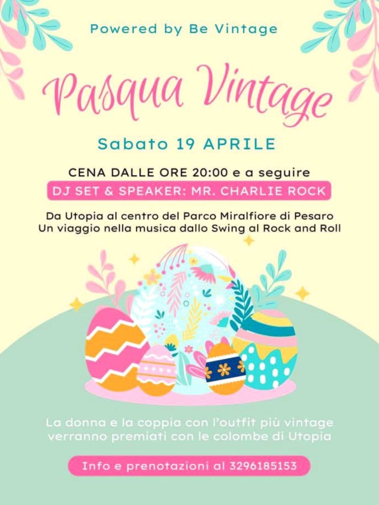 PESARO – “Pasqua Vintage”, Sabato 19 Aprile, Trattoria Sociale: UTOPIA, Parco Miralfiore, Pesaro (PU). Cena Spettacolo, dalle 20.30 in poi, con Menù fisso di Pesce/Vegetariano, a sole 25€, tutto incluso! Musiche e Balli, dagli anni ’20 ai ’60, con il famosissimo Dj: Mr. Charlie Rock! Premi alla Donna e alla Coppia con l’Outfit più Vintage! Prenotate: 329.6185153.