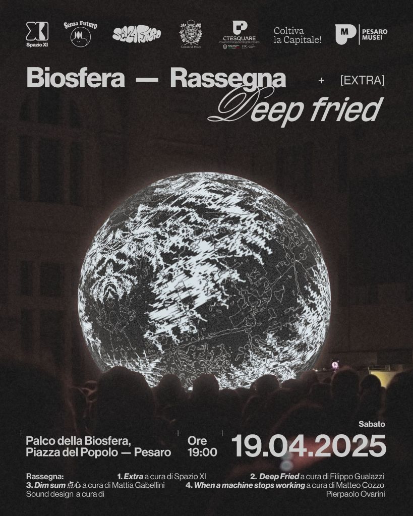 | Sabato 19 aprile sul palco della Biosfera in piazza del Popolo, un pomeriggio dedicato ai linguaggi contemporanei tra grafica, multimedia e suono. Protagonista lo spazio creativo Spazio XI inaugurato il mese scorso, che presenta alla città la sua vision e i contenuti che andranno ad arricchire il palinsesto della Biosfera. Pesaro ‘Coltiva la Capitale!’ e offre opportunità di dialogo tra linguaggi contemporanei per nuove multidisciplinarietà. Dopo il successo ottenuto il primo marzo, sabato 19 aprile la rassegna immersiva ‘Deep Fried’ si espande oltre il Centro Arti Visive Pescheria e arriva in piazza del Popolo, entrando a far parte della programmazione della Biosfera, scultura digitale interattiva unica in Europa con i suoi 4 metri di diametro e oltre 2 milioni di Led, simbolo di Pesaro 2024. Appuntamento alle 19 con Mattia Gabellini, Filippo Gualazzi e Pierpaolo Ovarini fondatori di Spazio XI, spazio creativo nato un mese fa a Pesaro, che ne racconteranno mission e vision. Alle 19.15 proiezione sulla Biosfera di un extra audiovisivo progettato per l’occasione a partire da una mappa del territorio che, elaborata e trattata da Spazio XI, diviene un mix di visioni, sperimentazioni e linguaggi. A seguire la prima proiezione delle tre opere immersive audiovisive della rassegna ‘Deep Fried’ ispirate al concept e ai contenuti dell’ultima uscita di Senza Futuro Magazine, che entreranno a far parte del palinsesto ufficiale della Biosfera. L’evento di aprile si pone come incontro tra i linguaggi visivi di oggi – l’editoria, la grafica, l’installazione audiovisiva immersiva e il sound design – e promuove la collaborazione di creativi di base a Pesaro con realtà nazionali del panorama delle nuove generazioni. L’incontro è realizzato con il patrocinio del Comune di Pesaro, partner: CTE Square Casa delle Tecnologie Emergenti di Pesaro, Pesaro Musei. Rassegna: Extra, a cura di Spazio XI Deep Fried, a cura di Filippo Gualazzi Dim Sum 点心, a cura di Mattia Gabellini When a machine stops working, a cura di Matteo Cozzo Sound design a cura di Pierpaolo Ovarini La rassegna è ispirata al concept e ai contenuti (con estratti) di Deep Fried, n°6 di Senza Futuro Direzione creativa: Spazio XI in collaborazione con Senza Futuro Studio, Senza Futuro Magazine Direzione artistica e graphic design: Mattia Gabellini Multimedia design: Filippo Gualazzi, Matteo Cozzo Sound design: Pierpaolo Ovarini Spazio XI Uno spazio creativo multidisciplinare in cui editoria, grafica, multimedia, tecnologia e suono si incontrano in un panorama contemporaneo, dialogando con le realtà del territorio. Fondato da Mattia Gabellini, Filippo Gualazzi e Pierpaolo Ovarini in corso XI Settembre 262, Pesaro, Spazio XI è una visione multidisciplinare. Un’ibridazione di linguaggi contemporanei che, incontrandosi, ne generano di nuovi. Un dialogo tra discipline, persone e territori per creare progetti ed esperienze originali. I designer creativi che lavorano all’interno di Spazio XI sono professionisti specializzati nel settore culturale, istituzionale e sperimentale/innovativo. Nello specifico, si occupano di graphic design e comunicazione visiva, progettazione editoriale, logo design e identità visiva, comunicazione visiva di eventi e mostre, installazioni interattive, ambienti immersivi, produzioni multimediali, videomapping, creative technology, spazializzazione sonora, sound design, informatica e produzione musicale Senza Futuro Magazine Pubblicazione di ricerca culturale nata a Londra e cresciuta a Torino, promuove l’uso del pensiero critico nei confronti del design, dell’arte e della cultura; è un prodotto editoriale di Senza Futuro, studio di design radicale applicato alla comunicazione + hub editoriale con sede a Torino. Comune di Pesaro |