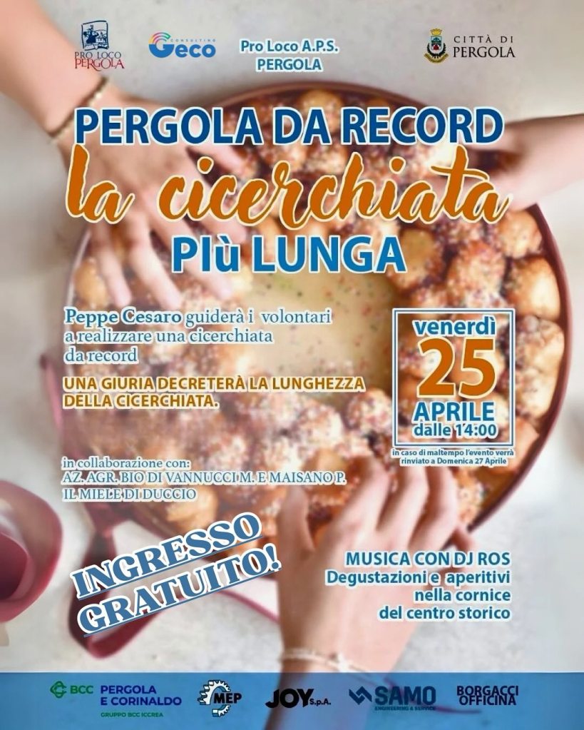 PERGOLA (Pesaro Urbino) – Nella città dei Bronzi dorati sarà un 25 aprile dolcissimo e divertente. Pergola è pronta per collezionare l’ennesimo record. Dopo le imprese passate, tra cui la salsiccia lunga un chilometro, il profiterole con oltre 6.000 bignè, la preparazione di 400 kg di pasta e di 6000 salsicce, si punta a un altro record. La Pro loco con il concittadino Giuseppe ‘Peppe’ Cesaro cercherà di realizzare la cicerchiata più lunga.
