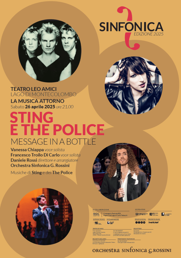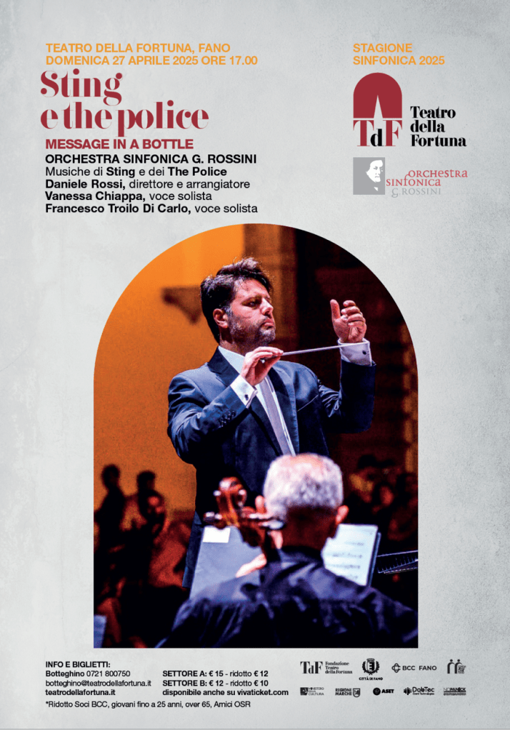 FANO – Dopo il fortunato debutto del progetto nel 2024, torna l’omaggio dell’Orchestra Sinfonica G. Rossini al cantautore britannico Sting nel progetto crossover “Sting & The Police – Message in a bottle”. In questi anni OSR ha ideato numerosi progetti che rileggono in chiave sinfonica le grandi pagine del pop, riscuotendo in tutta Italia unanimi successi: tra questi non poteva mancare l’omaggio a Sting, che, iniziata la carriera internazionale grazie al gruppo “The Police”, col quale ha girato il mondo, vincendo numerosi premi e vendendo più di 70 milioni di dischi, ha poi proseguito l’attività in veste di solista, pubblicando ben 25 dischi.