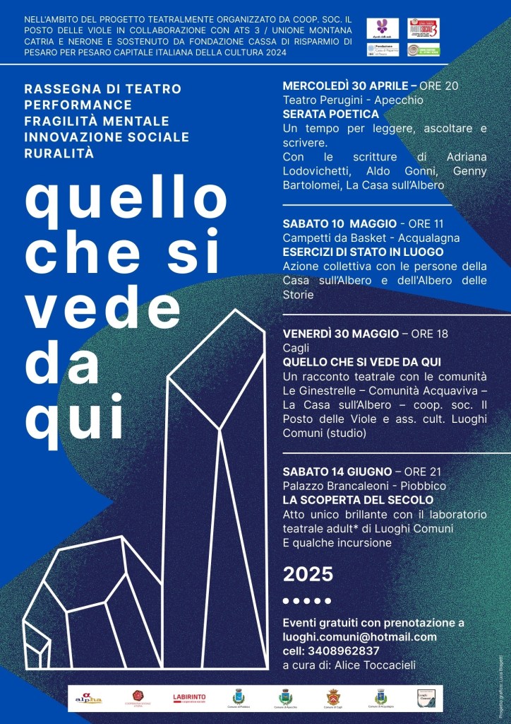 La rassegna, patrocinata dal Comune di Cagli, rientra nel progetto “Teatralmente”, coordinato dalla cooperativa sociale agricola Il Posto delle Viole e sostenuto dalla Fondazione Cassa di Risparmio di Pesaro nell’ambito delle attività per Pesaro Capitale della Cultura 2024. Quello che si vede da qui è curata da Alice Toccacieli dell’associazione Luoghi Comuni, e realizzata in collaborazione con ATS 3 – Unione Montana Catria e Nerone, cooperativa sociale Alpha, Labirinto cooperativa sociale, cooperativa sociale Utopia.
