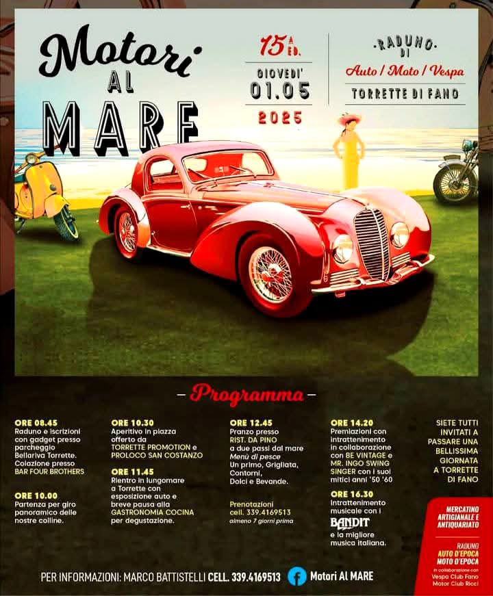 Giovedì 1 maggio 2025, l’evento “Motori al Mare” si unisce a “Be Vintage”! Il Lungomare Torrette di Fano si trasforma in un palcoscenico di passione e divertimento. Il pranzo spettacolo è sold-out con oltre 200 partecipanti. Dalle 14.00, ingresso libero al “Number Five Disco Club” di via Bosco Marina, con una quota di 10€ che include un drink. La pista da ballo è aperta a tutti i ballerini, di ogni genere, stile e livello, con musiche e balli che spaziano dagli anni ’20 agli anni ’60, accompagnati da Ingo Swing Singer, Dj e Showman!