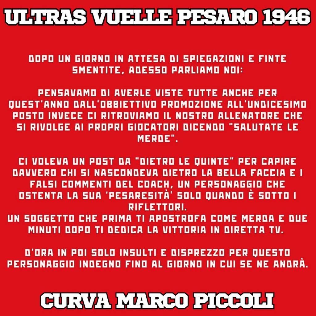 Il giorno seguente, la Curva Marco Piccoli Pesaro rompe il silenzio con un comunicato durissimo, in cui si accusa l’allenatore di doppiezza e opportunismo: