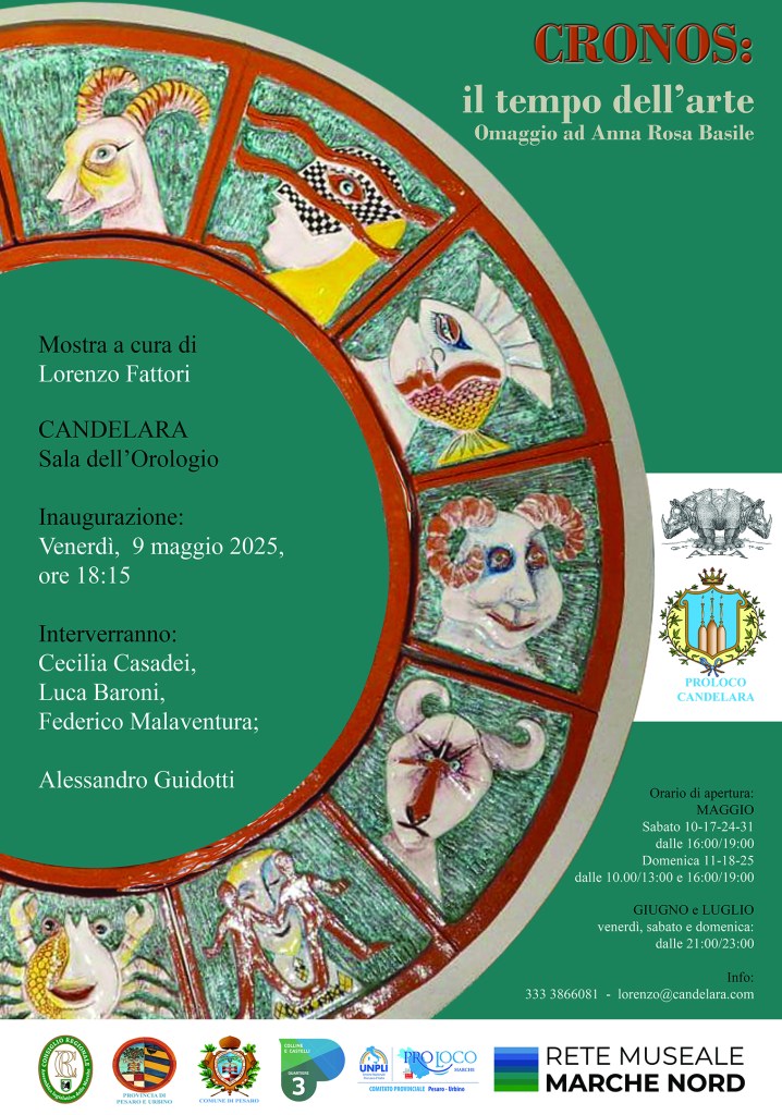 La mostra è intitolata “Cronos: il tempo dell’arte” ed è curata da Lorenzo Fattori. Protagonista è un grande disco maiolicato a bassorilievo policromo, denominato “Cronos”, che l’artista dona alla comunità di Candelara per arricchire il patrimonio artistico.