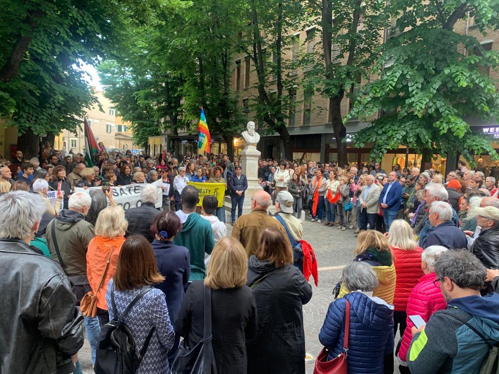 Un momento voluto dall’Amministrazione, «per interrogarsi assieme su come fermare la strage e per rompere il silenzio sullo sterminio in corso a Gaza – hanno sottolineato il sindaco Andrea Biancani e le assessore Camilla Murgia e Sara Mengucci – Pesaro scende in piazza come città gemellata con Rafah, contro la violenza, a difesa dei diritti umani e ancor più della vita di tutti e dell’identità di un popolo. Grazie ai tanti cittadini che hanno fatto sentire la propria presenza e vicinanza a tutti quelli che in questo momento si trovano sotto le bombe e in particolare al popolo palestinese che, più di altri, sta subendo le barbarie, le violenze, le uccisioni e i soprusi per mano del governo israeliano di Netanyahu».