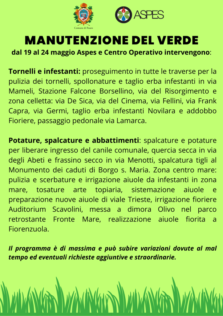 Taglio erba: Secondo taglio nella scuola Don Bosco e scuola primaria Pirandello di via Goito, scuola primaria e infanzia di Villa Fastiggi e Villa Ceccolini, nido Girotondo di via Lambro, centro ex idea di via Milazzo, parcheggio Pastrengo, scuola infanzia la Grande Quercia, nido Lilliput, incrocio di via Filangieri e sgambatoio di via Kennedy, area Bachetlet, aiuole Tribunale, aiuole via Bramante e aiuole largo piazzale Matteotti, Pasqualon, zona calata Caio Duilio e via Canale, Viale Trieste, parcheggio di via Sarnano, aiuola ponte Brigata Ebraica, aiuola strada Sotto la Rocchetta, spartitraffico di via Gorizia, Villa Olga, Giardini Nilde Iotti, aiuole e parco viale Zara, piazzale D’Annunzio, piazza Doria, piazzale Primo Maggio e via Milazzo, aiuola De Sabbata sotto cavalcaferrovia, via don Minzoni, Giro di Ronda, Chiusa di Ginestreto, via Barsanti e via Del Rio, aiuola spartitraffico via Mondini.