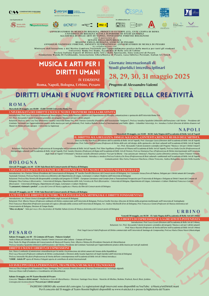 La musica e le arti hanno rappresentato negli ultimi cinquanta anni un formidabile strumento di promozione dei diritti umani. La creatività degli artisti impegnati per l’affermazione dei diritti fondamentali ha contribuito a rafforzare in tante parti del mondo i valori universali che esigono un rispetto assoluto in quanto cardine imprescindibile della dignità dell’essere umano: questi gli assunti di base del progetto nato a Bologna nel 2022 da una felice collaborazione tra il Conservatorio Martini e la Scuola Superiore di Studi Giuridici dell’Università. Le giornate propongono un confronto a più voci per evidenziare alcuni temi: la difficoltà di rendere effettivi i diritti umani in ogni parte del mondo, la loro relativa giustiziabilità, il confronto tra universalismo e multiculturalismo, la criticità dei diritti di ultima generazione. All’interno della cornice dei diritti umani si iscrive anche la dimensione della libertà di espressione artistica, come declinazione della più generale libertà di espressione: un’affermazione di libertà alla quale si accompagna però la constatazione di reiterate censure alla voce di tanti artisti che rendono difficile – quando non rischioso – l’esternazione delle proprie idee attraverso la creatività. L’edizione 2025 dal titolo ‘Diritti umani e nuove frontiere della creativita’ coinvolge numerose istituzioni, università e accademie di diverse città e punta l’obiettivo su alcuni aspetti fondamentali della produzione artistica contemporanea: come i nuovi traguardi della tecnologia in rapida espansione, soprattutto con l’affermarsi dell’intelligenza artificiale generativa in grado di sottrarre spazi e ruoli all’artista “in carne e ossa”, ma pure le nuove frontiere geografiche della creatività – dall’Africa alla Cina – con l’affermazione di un universale diritto alla bellezza, come aspetto dell’accesso al patrimonio culturale che evidenzia l’aumento delle diseguaglianze nei paesi più poveri e il sorgere di nuove forme di “schiavitù” nel lavoro intellettuale. Le sessioni di lavoro si arricchiscono di alcuni preziosi eventi di musica e di arte contemporanea e si concludono con la consegna dei riconoscimenti “Percorsi per i diritti umani” assegnati a quelle persone che hanno testimoniato con convinzione e dedizione nella propria professione l’impegno su questi temi.