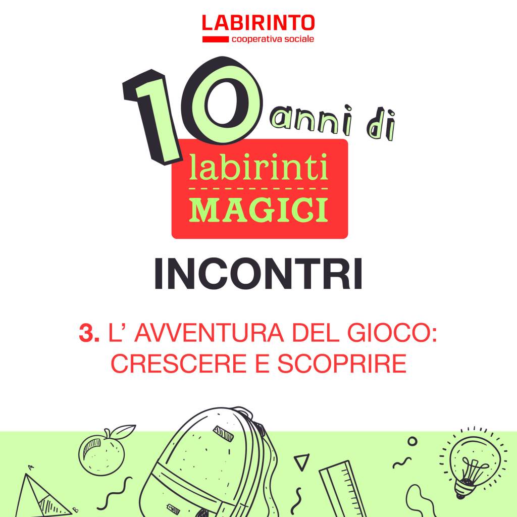 L’avventura del gioco: crescere e scoprire si inserisce nel ricco programa di iniziative che Labirinti Magici ha curato per festeggiare i suoi primi dieci anni di attività. Un percorso che comprende complessivamente cinque incontri formativi per adulti, quattro laboratori per bambine e bambini e una conferenza conclusiva sul tema della Cura, con esperte e professioniste.