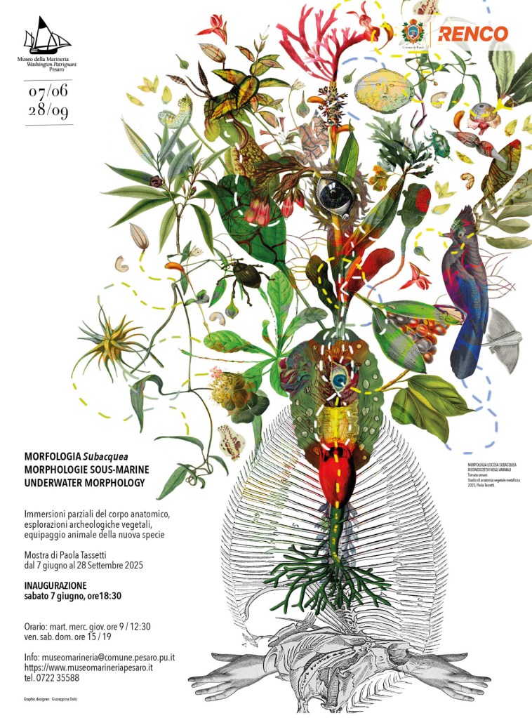 Sabato 7 giugno (ore 18.30) al Museo della Marineria Washington Patrignani di Pesaro inaugura ‘MORFOLOGIA Subacquea. MORPHOLOGIE SOUS-MARINE. UNDERWATER MORPHOLOGY’ la personale di Paola Tassetti che propone ‘immersioni parziali del corpo anatomico, esplorazioni archeologiche vegetali e l’equipaggio animale della nuova specie’.