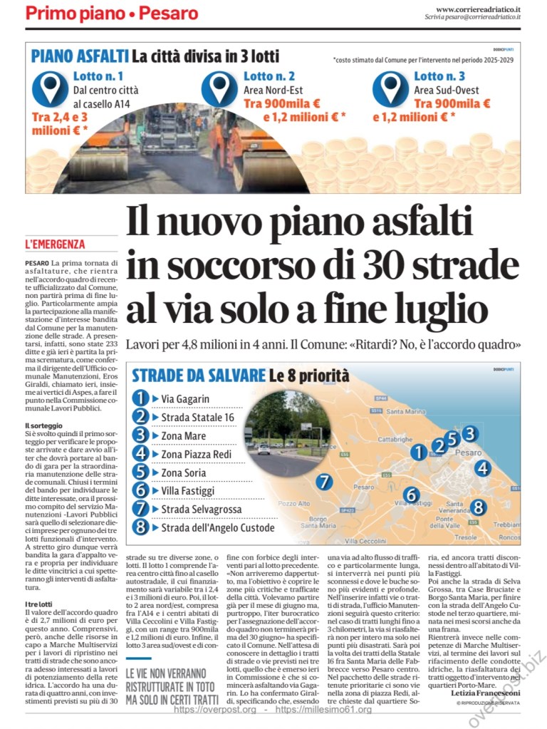 La seguente nota per fare chiarezza in merito all’articolo pubblicato a pagina 8 dal Corriere Adriatico – ed. Pesaro del 17 giugno 2025, dal titolo “Il nuovo piano asfalti in soccorso di 30 strade al via solo a fine luglio” che elenca, in un grafico, una serie di vie e zone interessate dai lavori di asfaltatura, ma che non sono mai state comunicate in via ufficiale dall’Amministrazione. Sempre in grafica si legge la dicitura: “le 8 priorità”. Priorità che il comune non ha ancora segnalato.