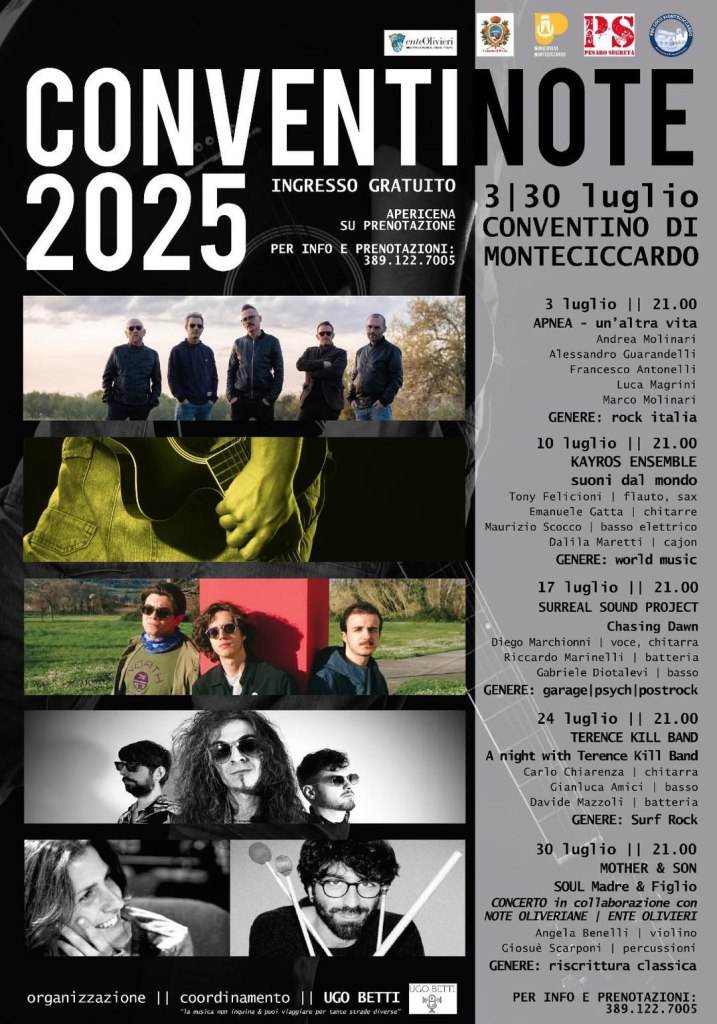 Sul palco saliranno, nell’ordine: Apnea (3 luglio), Kayros Ensemble (10 luglio), Surreal Sound Project (17 luglio), Terence Kill Band (24 luglio), SOL Madre & Figlio(30 luglio). «Il programma di ConventiNote 2025 sarà trasversale e per tutti i gusti – assicura Marika Pierucci, presidente del Municipio di Monteciccardo – per assicurare al consueto pubblico e al nuovo che lo integrerà, un’offerta musicale variegata e di qualità che sarà proposta nella splendida corte del Conventino dei Servizi di Maria, un palco che sta diventando un punto di riferimento per l’estate musicale delle nostre colline». Pierucci conferma anche la formula sfiziosa dell’aperitivo di apertura: «In cui assaporare le eccellenze del nostro territorio, dai salumi all’olio, passando per i formaggi, accompagnati da un calice di buon vino Doc grazie all’insostituibile supporto dell’associazione turistica Pro Loco di Monteciccardo».