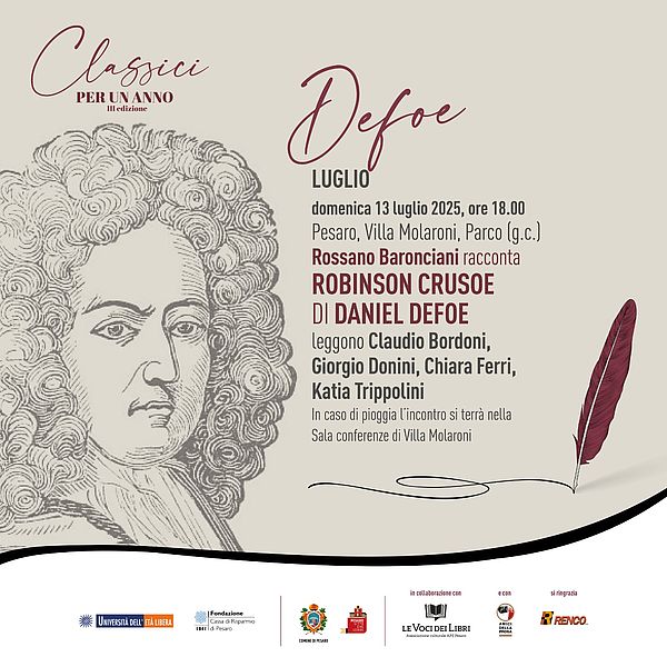 Curata da Enrico Capodaglio e Lucia Ferrati, con il sostegno della Fondazione Casa di Risparmio di Pesaro e il patrocinio del Comune di Pesaro, la rassegna Classici per un anno, edizione 2025 è organizzata dall’Università dell’Età Libera di Pesaro in collaborazione con l’associazione di promozione al libro e alla lettura Le Voci dei Libri APS e con l’associazione Amici della Prosa di Pesaro, con la gentile partecipazione di Istituto d’Istruzione Superiore “A. Cecchi”, Villa Caprile e Renco SPA.