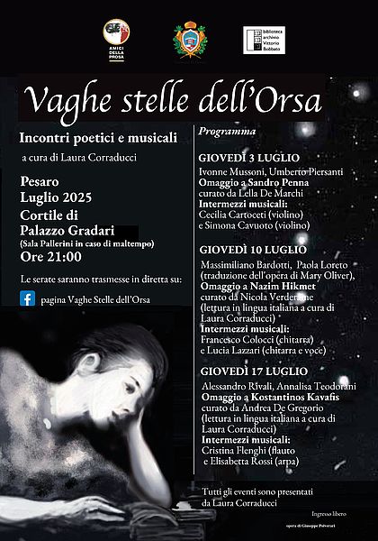 Come da tradizione, Laura Corraducci presenta voci poetiche che si racconteranno nel dialogo con la poetessa pesarese e, soprattutto, attraverso la lettura dei loro versi. Diventata oramai un punto di riferimento importante nel panorama culturale dell’estate pesarese in questi oltre dieci anni, la rassegna ha portato nella città, più di novanta poeti, fra italiani e stranieri, della poesia contemporanea. Anche in questa edizione, un poeta ospite renderà omaggio ad una delle voci più importanti che hanno segnato la storia della Poesia mondiale. Da sempre parte importante delle serate di Vaghe stelle dell’Orsa, la musica non mancherà di regalare emozioni grazie alla presenza di musicisti che interagiscono con la lettura dei versi in un connubio ogni volta intenso e profondo. L’edizione 2025 (la 12esima) di ‘Vaghe stelle dell’Orsa’, è organizzata dall‘Associazione Gad Amici della Prosa, con la Biblioteca Bobbato, in collaborazione con l’Assessorato alla Cultura del Comune di Pesaro a cura di Laura Corraducci.