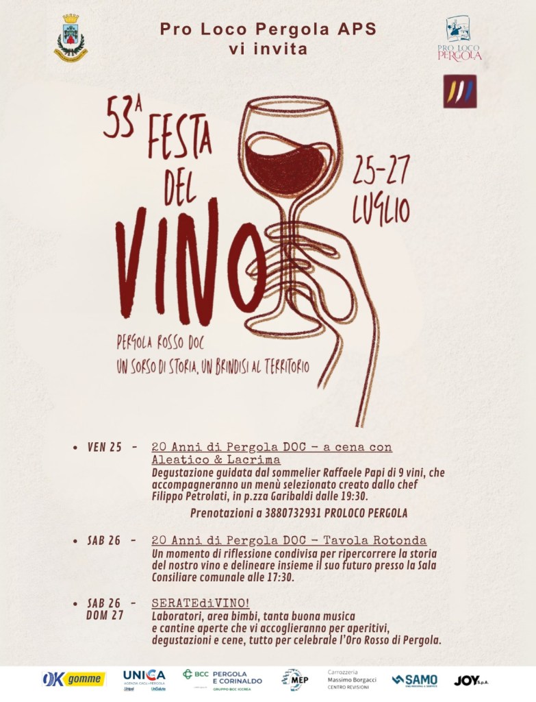 PERGOLA (Pesaro Urbino) – Un viaggio sensoriale tra tradizione, gusto e convivialità decollerà venerdì 25 luglio, quando a Pergola si alzerà il sipario sulla 53esima Festa del Vino, tra gli eventi enogastronomici più longevi e di successo della regione Marche. Ad organizzarla la Pro loco con il patrocinio del Comune.