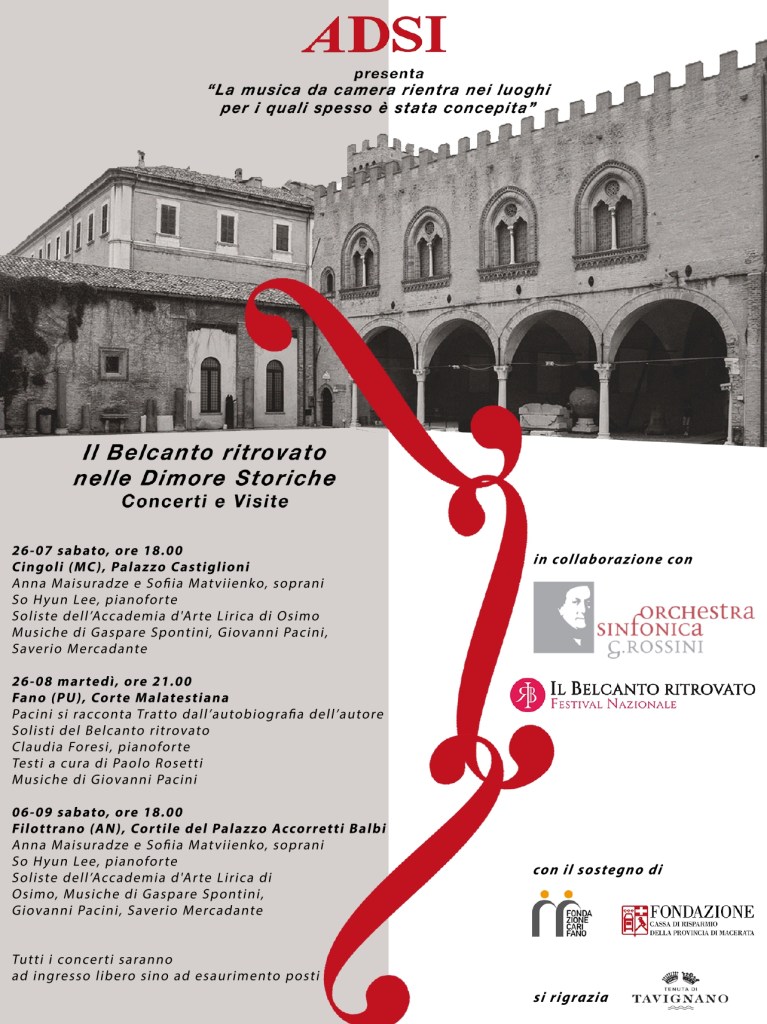 Inoltriamo con piacere il comunicato relativo ad un’iniziativa organizzata da ADSI – Associazione Dimore Storiche Italiane (sezione Marche) per la quale l’Orchestra Sinfonica G. Ross e il Festival Nazionale Il Belcanto ritrovato hanno curato l’aspetto artistico.