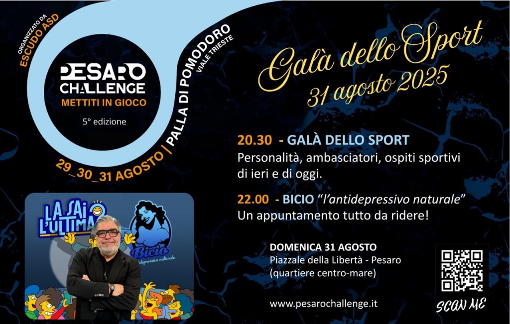 Domenica 31 agosto, dalle ore 20.30, il palco centrale della Palla di Pomodoro si trasformerà in un grande teatro a cielo aperto, pronto per ospitare il “GALA dello Sport” che sarà uno degli appuntamenti clou del Pesaro Challenge, la manifestazione di tre giorni organizzata dall’ASD Escudo e affiliata ad ASI Comitato Regionale Marche, dedicata a far conoscere e valorizzare le realtà sportive del territorio in vista della nuova stagione.