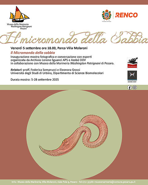 Venerdì 5 settembre alle ore 18.00 nel Parco di Villa Molaroni si terrà l’inaugurazione della mostra fotografica Il Micromondo della sabbia che sarà visitabile al Museo della Marineria Washington Patrignani fino al 28 settembre. Per l’occasione, viene proposta la conversazione promossa da Archivio Loreno Sguanci APS e Azobé ODV in collaborazione con il Museo; relatori saranno Federica Semprucci e Eleonora Grassi, docenti del Dipartimento di Scienze Biomolecolari dell’Università degli Studi di Urbino.