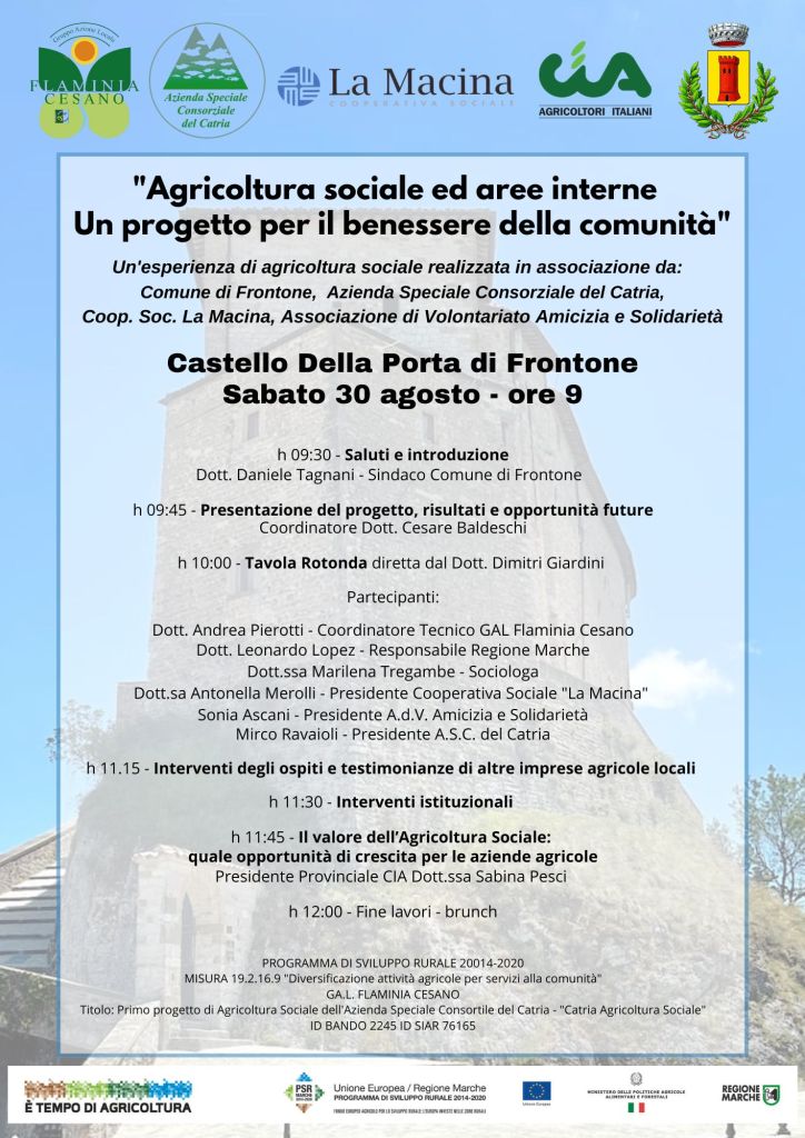 Il Castello della Porta di Frontone sabato 30 agosto alle 9, ospiterà il convegno conclusivo del progetto di Agricoltura Sociale, dal titolo “Agricoltura sociale ed aree interne. Un progetto per il benessere della comunità”.