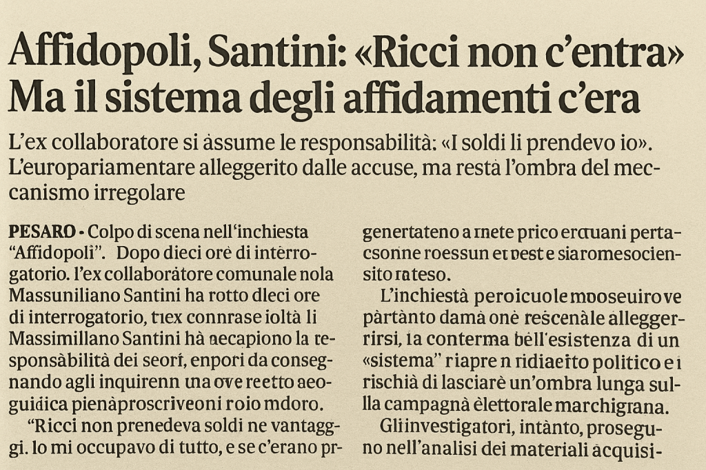 Pesaro – Colpo di scena nell’inchiesta “Affidopoli”. Dopo dieci ore di interrogatorio, l’ex collaboratore comunale Massimiliano Santini ha deciso di parlare. Davanti agli inquirenti ha scagionato l’ex sindaco e oggi europarlamentare Matteo Ricci, ma allo stesso tempo ha confermato l’esistenza di un sistema di affidamenti diretti che per anni avrebbe guidato alcuni appalti comunali.