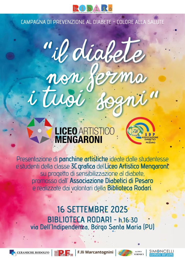 Alle 16.30 appuntamento per la presentazione delle panchine artistiche ideate dagli studenti della classe 3 C grafica del Liceo Artistico Mengaroni e decorate dai volontari della Biblioteca, nell’ambito della Campagna di prevenzione al diabete – colore alla salute ‘il diabete non ferma i tuoi sogni’ promossa dall’Associazione Diabetici di Pesaro. A partire dal 2023, l’associazione che ha tra gli scopi statutari la sensibilizzazione verso questa malattia, ha avviato un progetto per far conoscere il diabete di tipo 1 che colpisce principalmente le persone giovani. In occasione del convegno organizzato a Pesaro nel 2024 dal diabetologo pediatrico Valentino Cherubini, è stata collocata in viale Trieste la prima panchina ‘blu’, colore simbolo del diabete. Per estendere l’iniziativa a tutti i quartieri della città in collaborazione con l’Assessorato alle Politiche Sociali del Comune, l’associazione ha coinvolto il Liceo artistico F. Mengaroni. Da qui è nato il progetto cui hanno preso parte gli studenti e le studentesse della classe 3 C di grafica che durante l’anno scolastico 2024-’25, guidati dalla professoressa Isabella Galeazzi hanno elaborato proposte per la decorazione di panchine artistiche seguendo il tema ‘Il diabete non ferma i tuoi sogni’. L’Associazione Diabetici ha selezionato alcuni lavori e nei mesi estivi gli amici/volontari della Biblioteca di Quartiere Rodari hanno decorato le prime due panchine che verranno presentate il 16 settembre. Proprio in quel giorno, una panchina verrà allestita nel giardino della Biblioteca di Borgo Santa Maria alla presenza del direttivo dell’associazione diabetici, della dirigente Serena Perugini e della professoressa Isabella Galeazzi con i suoi allievi del Mengaroni e delle bibliotecarie della Rodari.