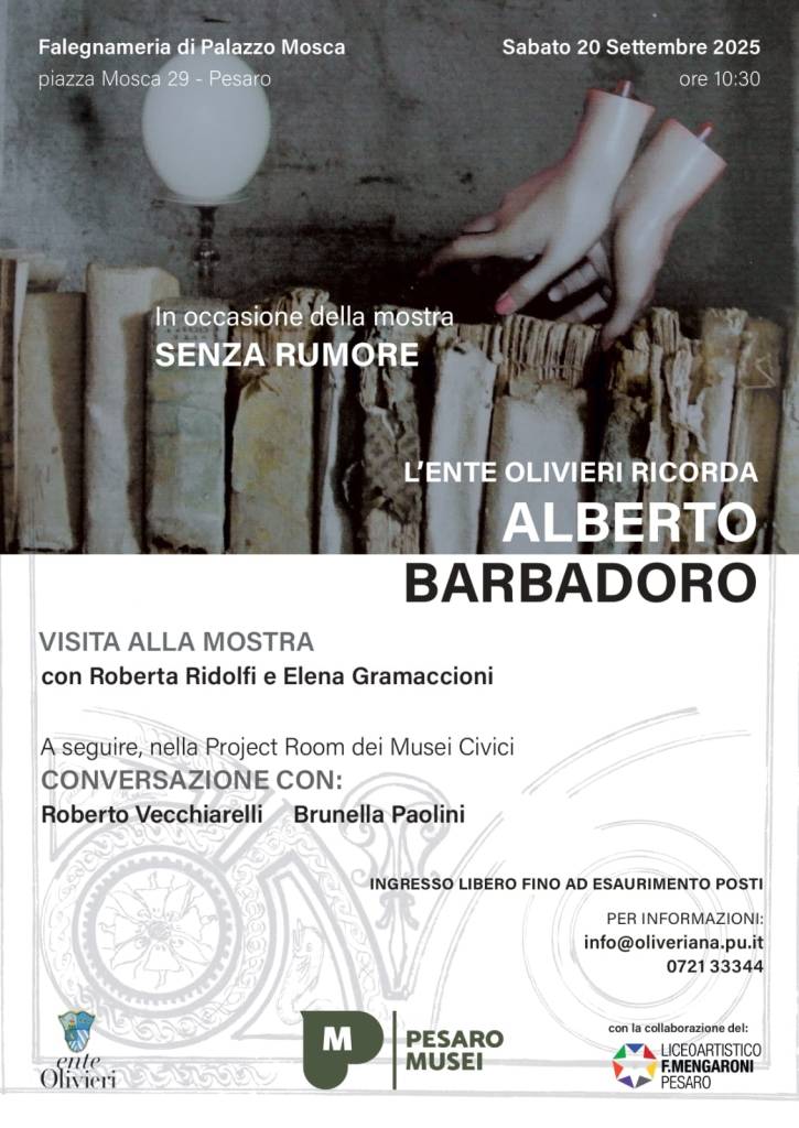 In occasione della mostra, che omaggia Alberto Barbadoro nei 10 anni dalla morte, l’Ente Olivieri – Biblioteca e Musei Oliveriani intende omaggiare questo artista così poliedrico e innovativo, che per diversi anni curò la comunicazione dell’Ente, divenendone la firma grafica: a tal proposito sabato 20 settembre alle 10.30 organizza una visita alla mostra, con Elena Gramaccioni e Roberta Ridolfi, seguita da una conversazione nella Project Room dei Musei Civici con Brunella Paolini, direttrice dell’Ente Olivieri, e Roberto Vecchiarelli, autore delle oltre 3500 fotografie scattate in Oliveriana e protagoniste di Intus Labor, una minuziosa “esplorazione” degli ambienti più reconditi di Palazzo Almerici che nel 2010 fu oggetto di una mostra omonima al Centro Arti Visive Fondazione Pescheria; tra le opere in mostra, le cartoline rielaborate digitalmente da Alberto Barbadoro, che popolò di creature oniriche le antiche sale della Biblioteca Oliveriana.