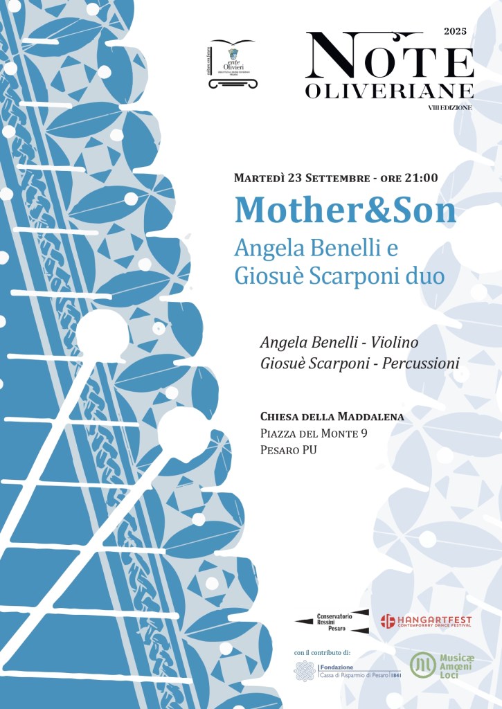 Il duo d’eccezione Mother & Son, composto da Angela Benelli al violino e Giosuè Scarponi alle percussioni, si esibirà in un accattivante repertorio di autori contemporanei, la cui comune caratteristica è l’aver indirizzato propria ricerca artistica all’insegna di un ‘espressione musicale che pone il ritmo, piuttosto che la melodia, al centro della dimensione compositiva.