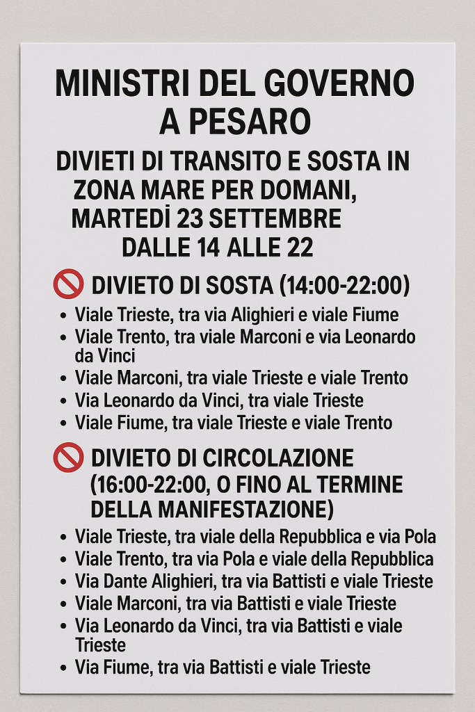Il Comune di Pesaro comunica che domani pomeriggio, martedì 23 settembre, in occasione della manifestazione che si svolgerà in un hotel del lungomare di Pesaro, alla presenza del vicepresidente del Consiglio e dei Ministri del Governo, la viabilità cittadina subirà importanti modifiche.