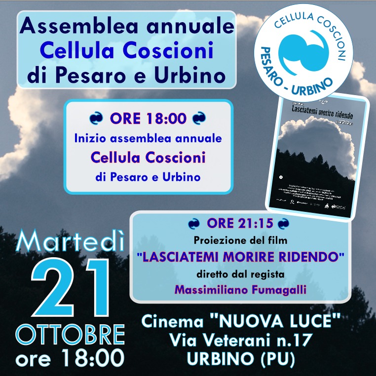 – Assemblea della Cellula Coscioni di Pesaro e Urbino, a Urbino il 21 ottobre alle ore 18 presso il cinema Nuova Luce in via Veterani n.17. Nel corso dell’assemblea verrà presentato il report delle attività svolte e gli obiettivi per il nuovo anno e saranno rinnovate le cariche sociali della Cellula. La partecipazione all’assemblea è aperta a tutte e a tutti.