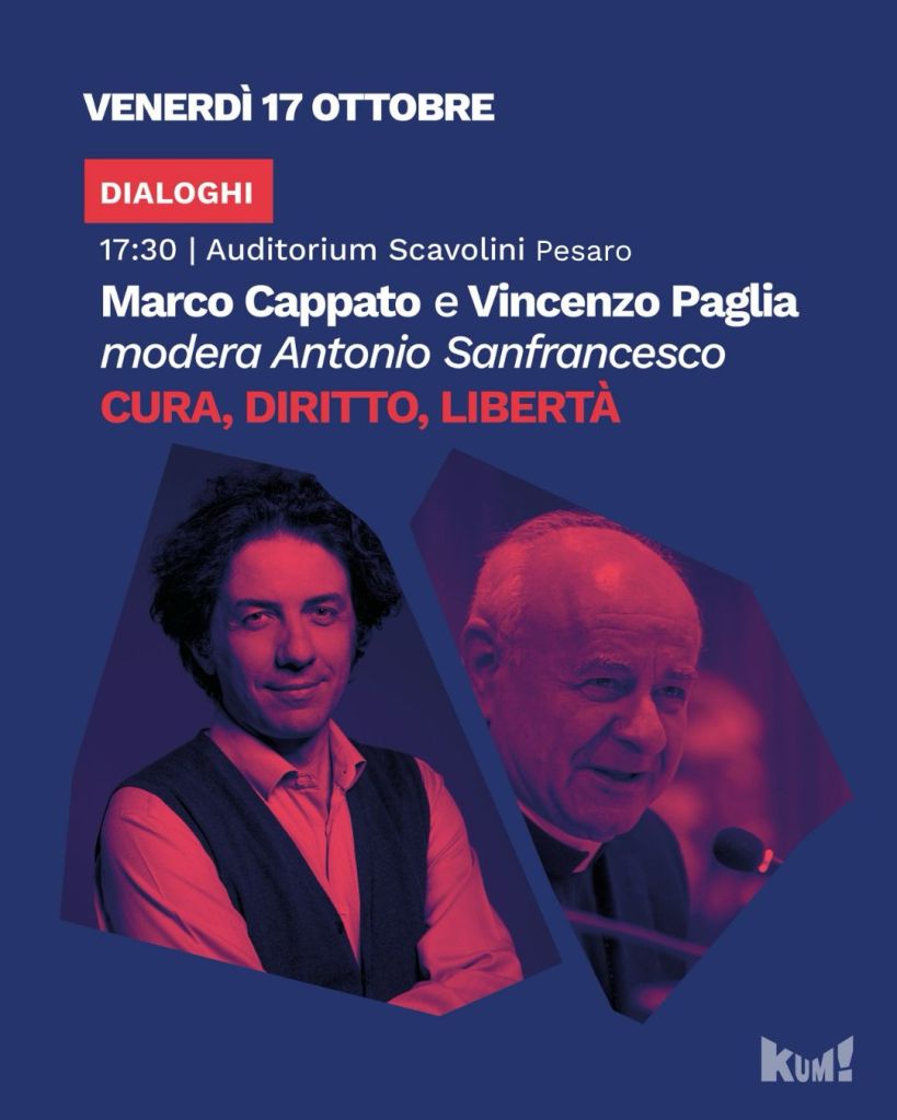 – Marco Cappato, tesoriere nazionale dell’Associazione Luca Coscioni, sarà a Pesaro il 17 ottobre alle 17,30 presso l’Auditorium Scavolini per un confronto con Monsignor Vincenzo Paglia, su “Cura, diritto e libertà” (evento organizzato da Kum! festival). La nostra Cellula organizzerà all’interno della sala un tavolo informativo su tematiche relative al fine vita, testamento biologico ecc.