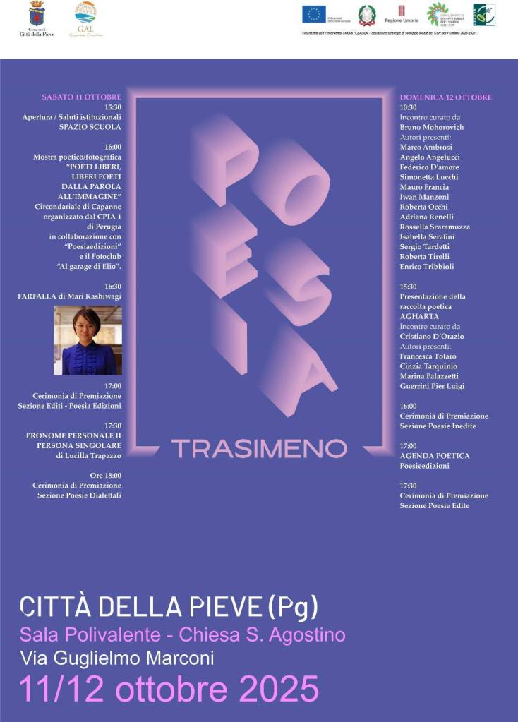 Si è tenuta nei giorni 11 e 12 Ottobre presso la sala Polivalente – ex chiesa di Sant’Agostino a Città della Pieve la quarta edizione di “Poesia Trasimeno”, la manifestazione dedicata alla poesia che ha visto la partecipazione di un notevole numero di autori provenienti da varie regioni italiane e si è arricchito anche di presenze internazionali.