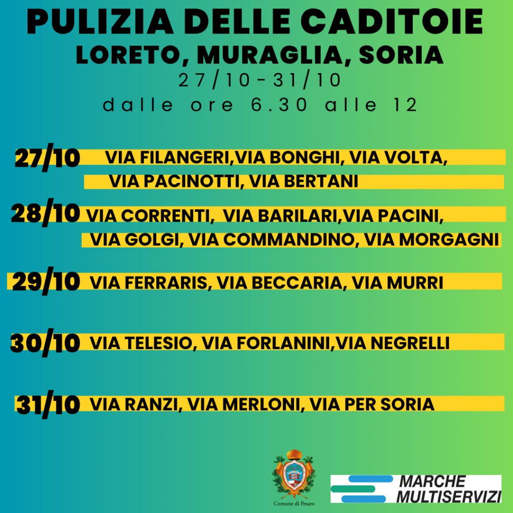 Continua la pulizia delle caditoie su suolo pubblico della città. In questa settimana, da lunedì 27 a venerdì 31 ottobre, Marche Multiservizi interverrà, al mattino, in zona Loreto, Muraglia, Soria.