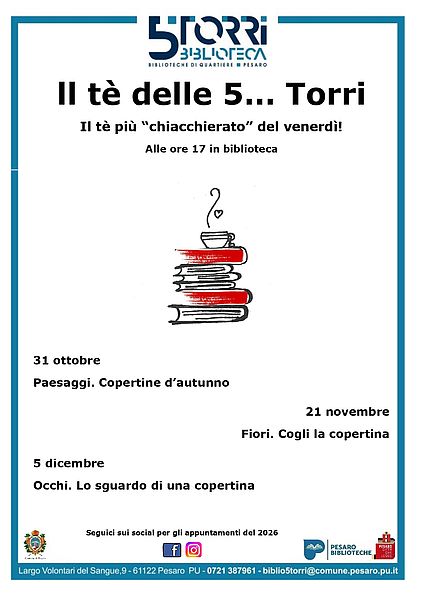 Promossa dalla Biblioteca Umberto Spadoni – 5 Torri, la rassegna ‘Il Tè delle 5 Torri’ propone un appuntamento al mese (il venerdì) in cui si presenta una selezione di libri da cui sono estratte letture. Ognuno dei partecipanti può intervenire con una sua proposta. Dopo le presentazioni, ci si ritrova per un momento conviviale a base di tè caldo, torte e biscotti per discutere in libertà delle proposte bibliografiche e per conoscersi.
