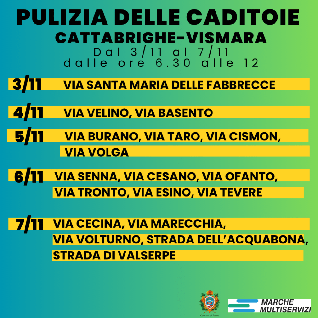 Continua la pulizia delle caditoie su suolo pubblico della città. In questa settimana, da lunedì 3 a venerdì 7 novembre, Marche Multiservizi interverrà, al mattino, a Cattabrighe e Vismara.