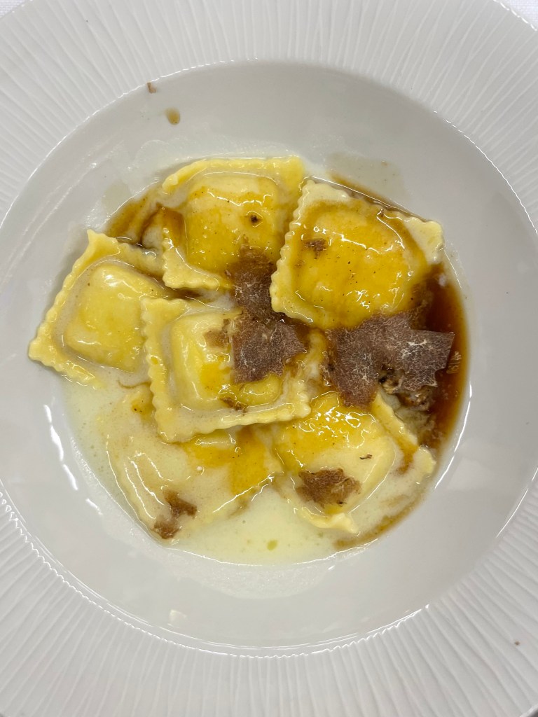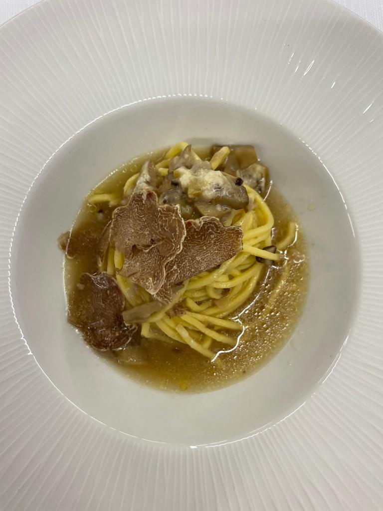 Le ricette sul podio: Ramen di Spaghetti alla Chitarra con porcini, castagne, colombaccio e tartufo bianco (Alba) e la ricetta “Il cortile e il bosco”, ravioloni al Parmigiano, cremoso di Casciotta d’Urbino DOP estratto di Faraona arrosto e tartufo bianco (Acqualagna).