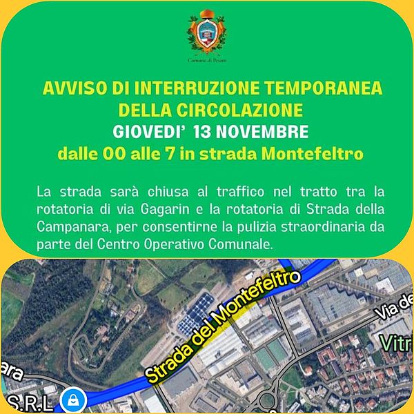 Si informa che giovedì 13 novembre, dalle 00 alle 7, strada Montefeltro sarà chiusa al traffico per consentire la pulizia straordinaria nel tratto tra la rotatoria di via Gagarin e la rotatoria di Strada della Campanara.