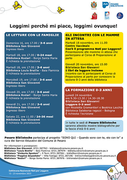 Le iniziative sono a cura delle bibliotecarie di Pesaro Biblioteche con la partecipazione delle Lettrici Volontarie Nati per Leggere, e sono inserite nel quadro delle proposte di Pesaro Città che Legge e nel progetto ‘Sono qui. Quando sono con te, sto con te’ promosso dai Servizi Educativi comunali.