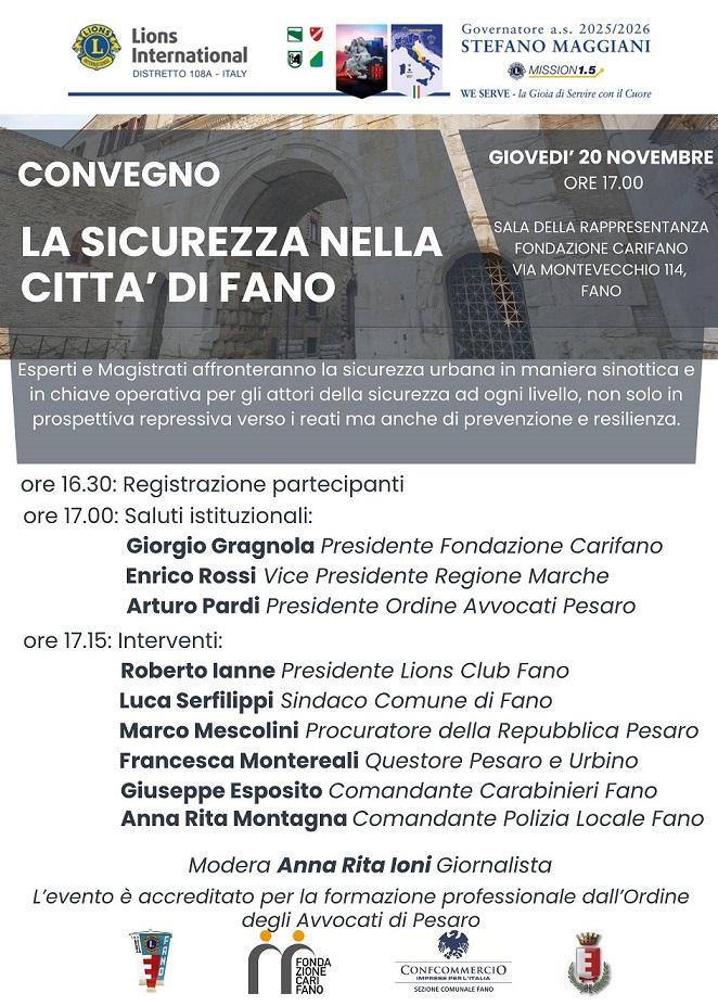 Il Lions Club di Fano, in collaborazione con la Confcommercio di Fano, ha organizzato un importante convegno dedicato al tema della sicurezza urbana, un argomento sempre più centrale nel dibattito pubblico e nelle politiche locali. L’iniziativa, intitolata “La Sicurezza nella Città di Fano”, si terrà il 20 NOVEMBRE alle ore 17 presso la Sala di Rappresentanza della Fondazione Carifano via Montevecchio 114, e riunirà esperti, magistrati, amministratori, rappresentanti delle forze dell’ordine, associazioni e cittadini.