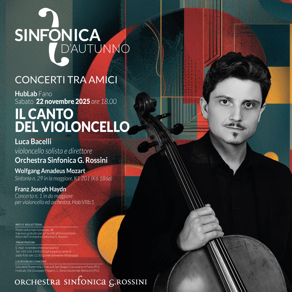 Dopo l’apertura con “Armonie per clarinetto ed archi” nella Sala della Fraternità di Cuccurano, questo segmento sinfonico giunge negli spazi di HubLab a Bellocchi di Fano, con un concerto che mette al centro la voce calda e intensa del violoncello.