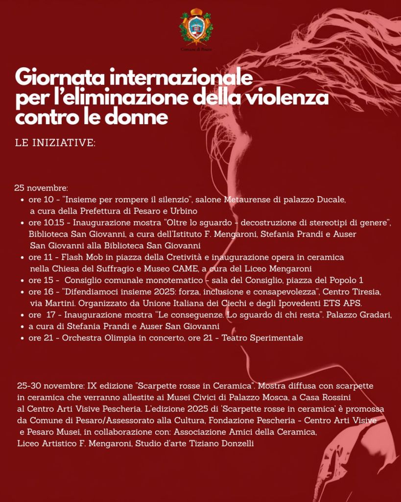 In occasione della Giornata internazionale per l’eliminazione della violenza contro le donne, che ricorre domani, martedì 25 novembre, il Comune di Pesaro promuove un ricco calendario di iniziative. Un percorso di incontri, testimonianze, eventi culturali e momenti di sensibilizzazione che coinvolgono cittadini di tutte le età, pensato per tenere alta l’attenzione su un tema che coinvolge l’intera comunità e che richiede consapevolezza, responsabilità e impegno quotidiano.