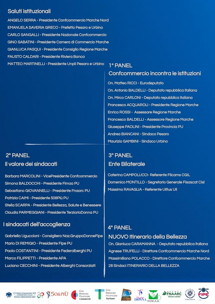 Saluti istituzionali: ANGELO SERRA – Presidente Confcommercio Marche Nord; EMANUELA SAVERIA GRECO – Prefetto Pesaro e Urbino; CARLO SANGALLI – Presidente Nazionale Confcommercio; GINO SABATINI – Presidente Camera di Commercio Marche; GIANLUCA PASQUI – Presidente Consiglio Regione Marche; FAUSTO CALDARI – Presidente Riviera Banca; MATTEO MARTINELLI – Presidente Unpli Pesaro e Urbino