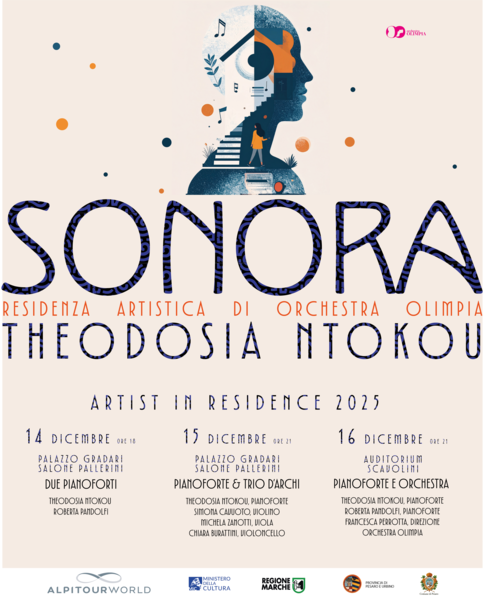 Domenica 14 dicembre (ore 18), nel Salone Antonia Pallerini di Palazzo Gradari, al via ‘Sonora’, l’innovativo progetto di residenza musicale di Orchestra Olimpia. Ospite di questa prima edizione la pianista greca Theodosia Ntokou, artista di fama internazionale e protégé della leggendaria Martha Argerich. L’incontro tra le due musiciste culminerà in tre concerti di restituzione aperti al pubblico. Prima tappa il 14 dicembre, alle 18: Ntokou suonerà con Roberta Pandolfi in un concerto a due pianoforti. Nel secondo concerto, sempre al Pallerini del Gradari, lunedì 15 dicembre, alle 21, Ntokou e un trio d’archi di Orchestra Olimpia proporranno un programma che affianca Mozart e trascrizioni di grandi successi rock, pop, soul e world. L’ultimo concerto, martedì 16 dicembre alle 21, vedrà sul palco dell’Auditorium Scavolini, Orchestra Olimpia con Theodosia Ntokou e Roberta Pandolfi come soliste al pianoforte, dirette da Francesca Perrotta (in programma musiche di Šostakovič, Poulenc e Beach).